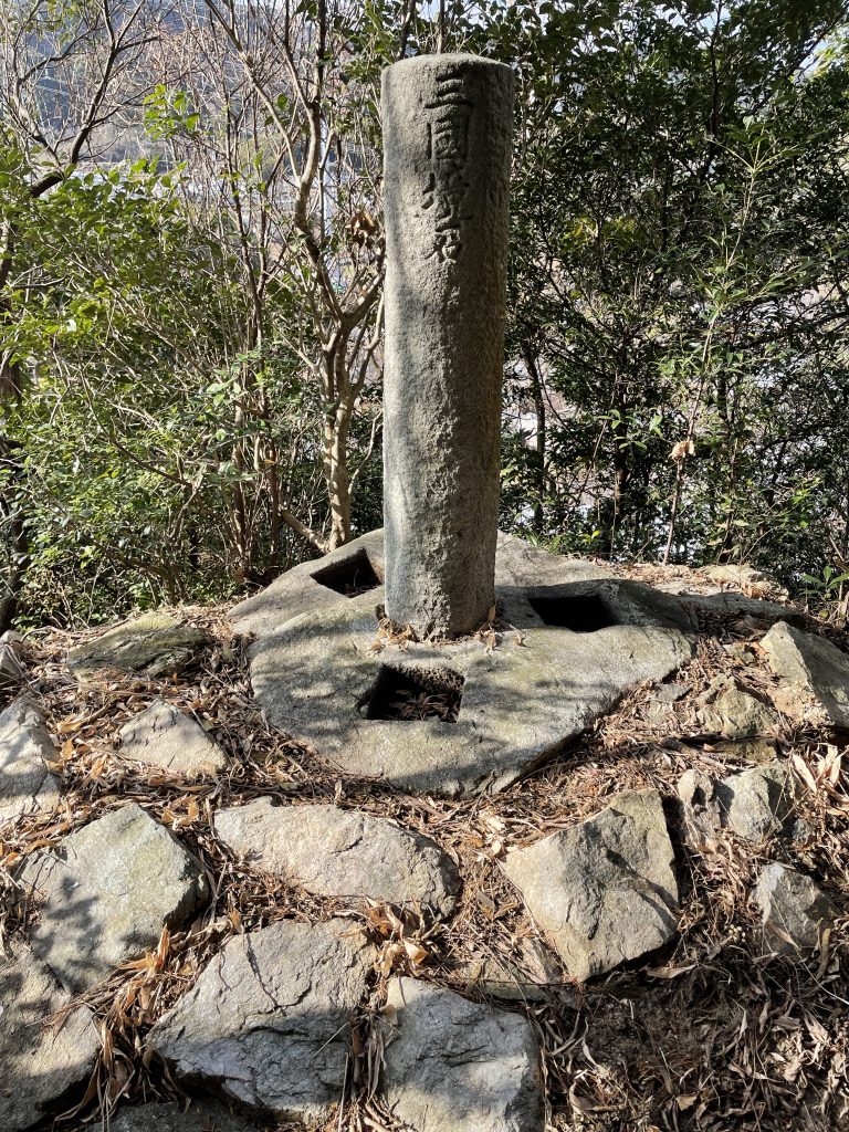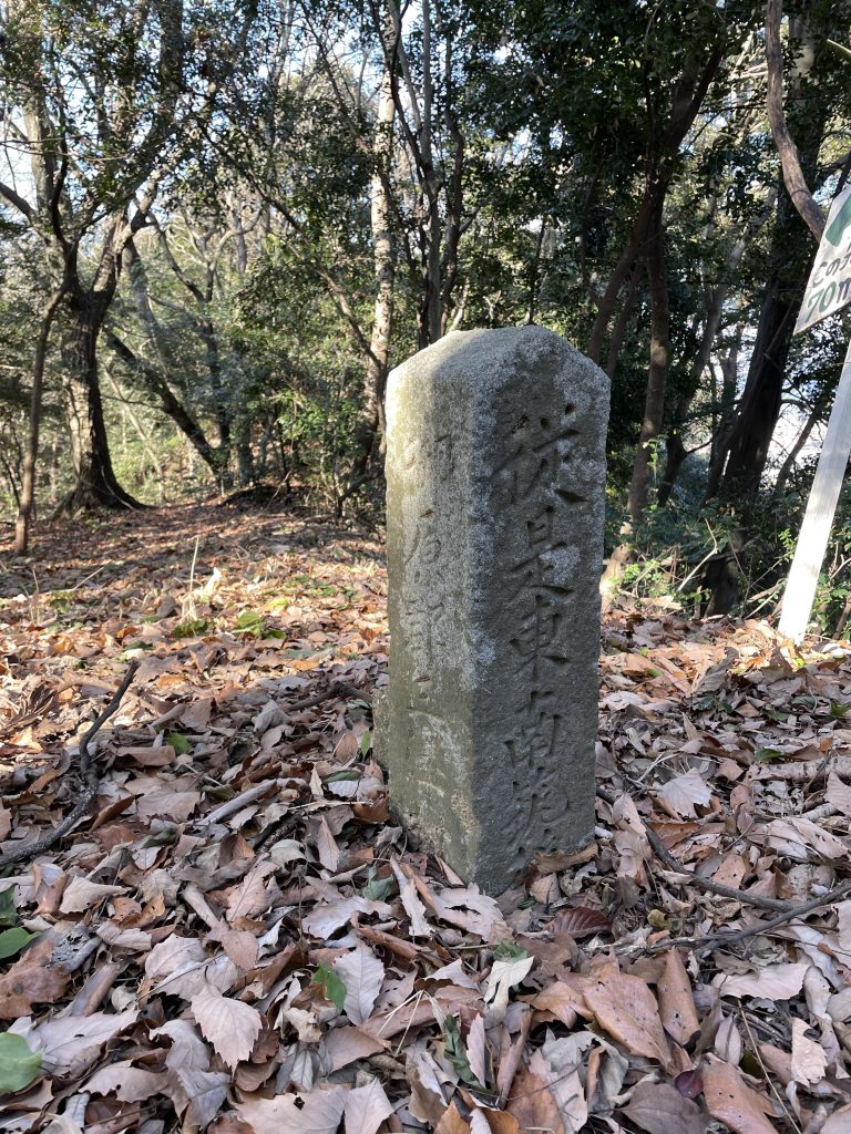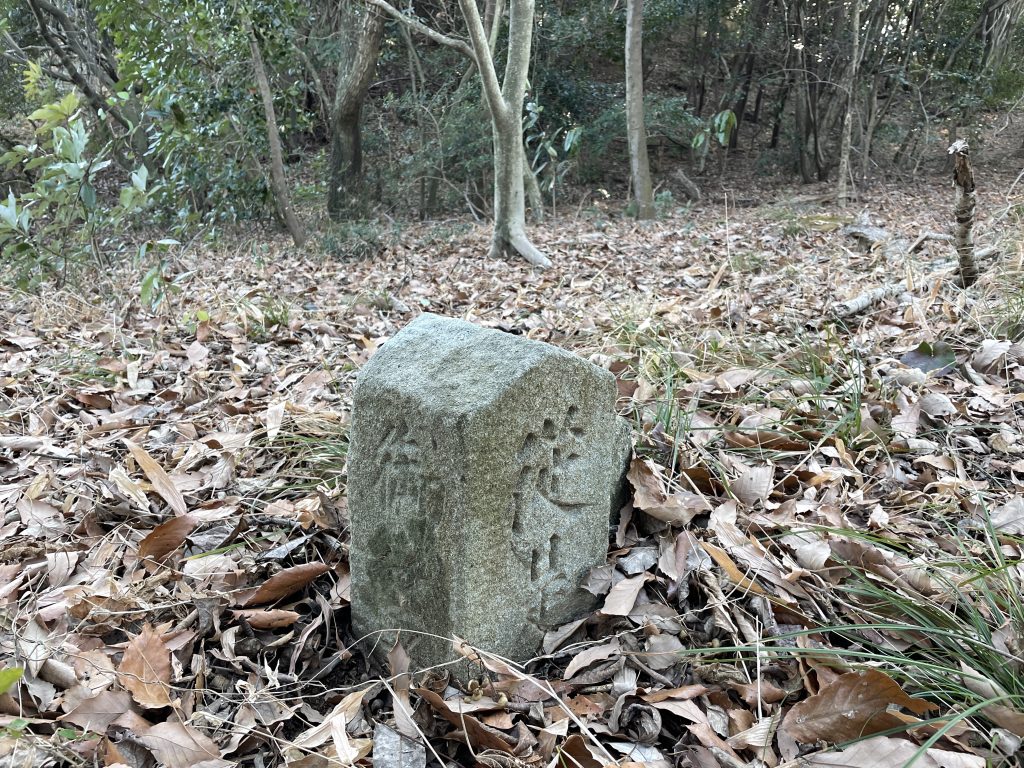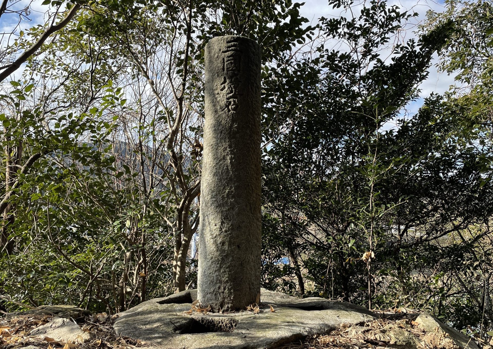 三国境石に到着です!周りに見える四角い穴には石柱がはめ込まれていたようですが今はありません。基壇と石垣も当時のままです。初めてこれを見た時は興奮しました。とても特徴的で珍しい形をした国境石だと思います。木々を伐採すれば見晴らしはいいでしょう。