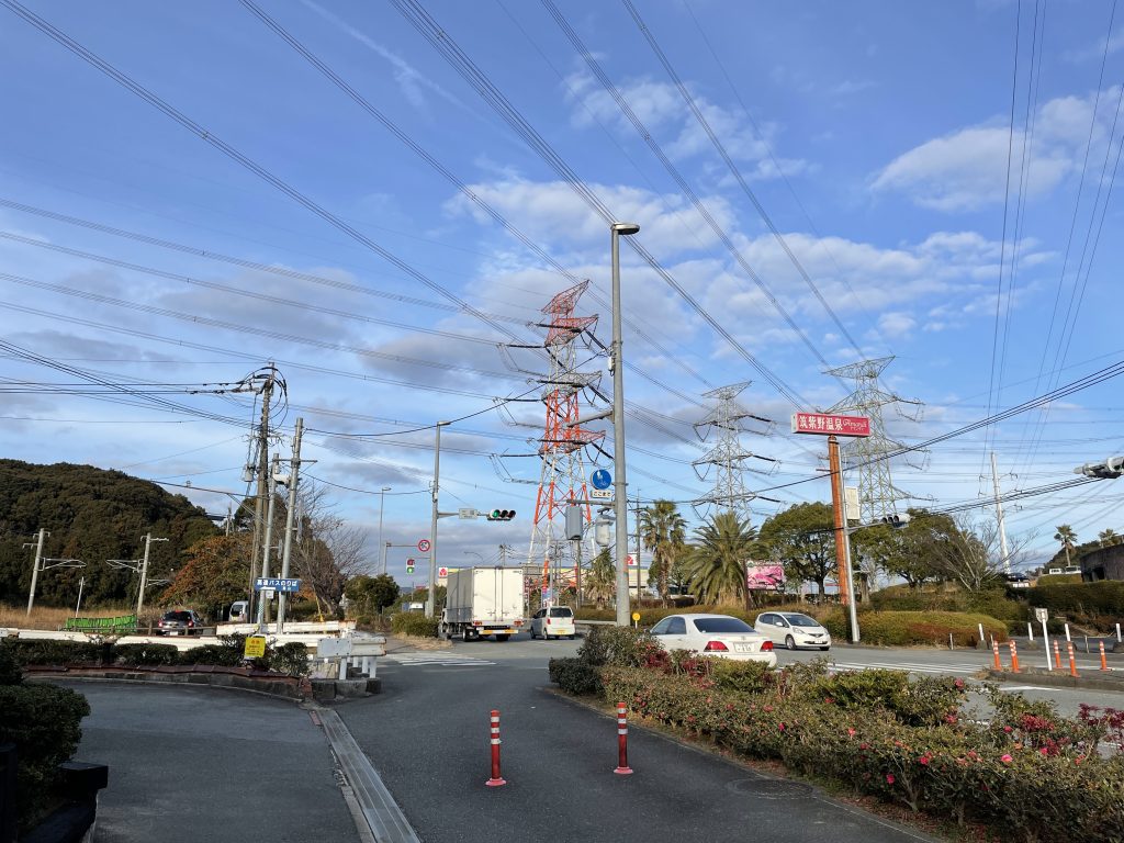 それでは散策スタート!車でお越しの際はこの交差点の左側に無料駐車場(約5台分)があるので、参考にして下さい。国道3号線の右手に筑紫野温泉アマンディがあり、左手にJR鹿児島本線が通っています。