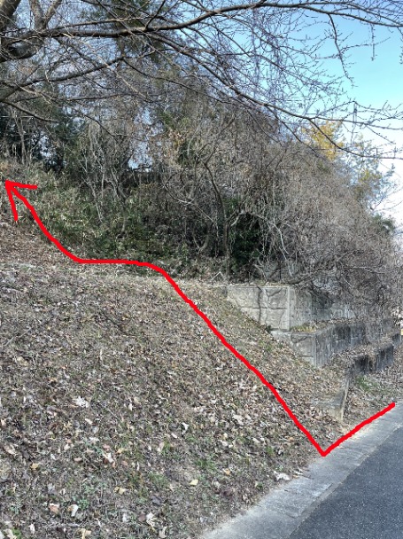 しかしどうしても見たかった私は、周辺をぐるぐる散策してなんとか発見することができました。そのルートは一般道に面した斜面をよじ登らなければならず、足場も悪く手摺もありません。今回の散策ではそのルートを紹介しますが、正直お勧めできないので本当に興味のある方は参考にして下さい。今後、貴重な遺跡を広く知ってもらうために整備されること強くを望みます。