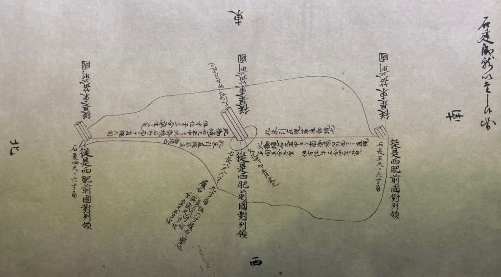 そこで御境目方で早良郡田嶋村の庄屋が協議に参加。枯れ松を除去し、問題となる野地を測量して等分することで妥協しました。すると今度は測量方法で意見が対立。肥前国姫方村の庄屋が協議に参入します。こうして何とか二国境石は建立されたのです。写真はその絵図です。