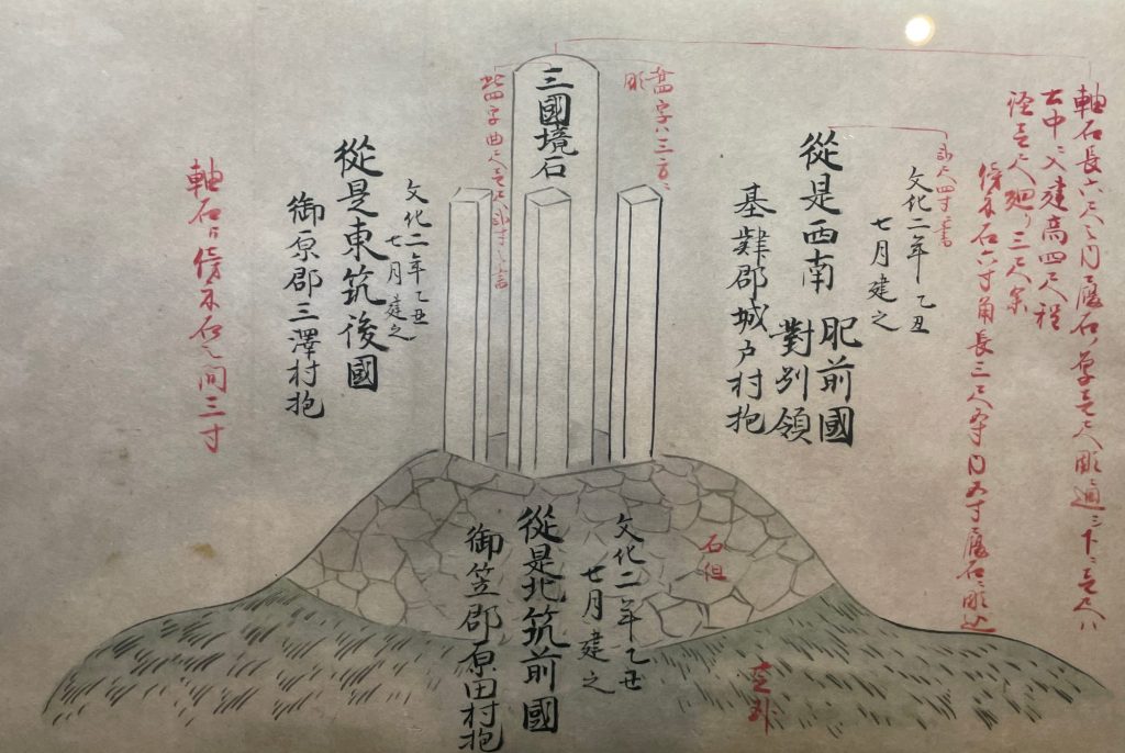 こうして筑前・筑後・肥前の三者による協議が始まります。筑前からは山口村大庄屋・原田村庄屋、筑後からは三沢村庄屋、肥前からは城戸村庄屋が参加しています。こうした協議には村の庄屋が地域を代表して参加するのですね。文化2年(1805)三国の国境を示す三国境石が建てられました。写真は三国境石が建立されたことを伝える絵図です。筑紫野市の「ふるさと館ちくしの」で見ることができます。