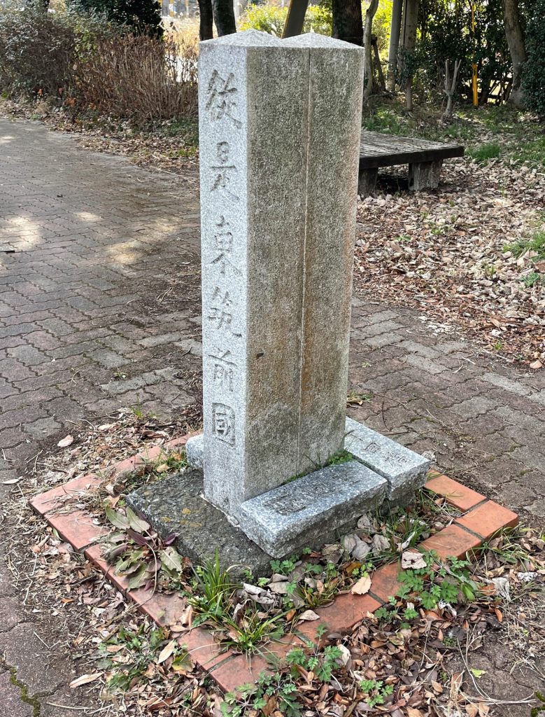 筑前と肥前の国境を定めた二国境石。二つの石柱が背中合わせに立っている構造をしており、その背中合わせの線が国の境界線を示しています。アマンディ側に「従是東筑前国」、JR線路側に「従是西肥前国對州領」と刻まれています。對州とは対馬のことですね。